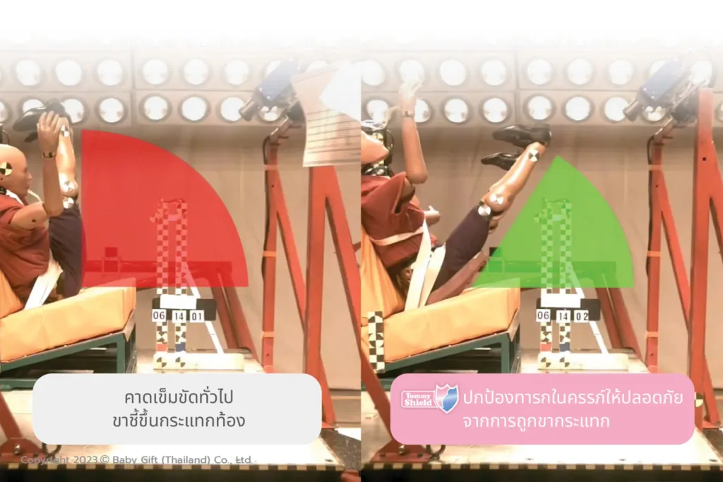 ผลการทดสอบความปลอดภัยด้วยเทคโนโลยีเดียวกันกับการทดสอบคาร์ซีท หรือที่นั่งนิรภัยสำหรับเด็ก โดยการใช้หุ่น Dummy จำลองแบบคาดเข็มขัดนิรภัยใต้ครรภ์แบบปกติทั่วไป กับหุ่นจำลองที่ใช้คาร์ซีทแม่ท้อง Tummy Shield พุ่งมาด้วยความเร็วแล้วเบรคกระทันหัน พบว่า ขาของหุ่นที่ใช้คาร์ซีทแม่ท้อง Tummy Shield (ภาพขวา) มีองศาการตีขึ้นของหน้าขาขึ้นมาทางลำตัวหรือหน้าท้องน้อยกว่า ในขณะที่ขาของหุ่นจำลองที่คาดเข็มขัดแบบปกติทั่วไป (ภาพซ้าย) ตีกลับขึ้นมาสูงถึงบริเวณลำตัว หรือโดนท้อง ซึ่งในสภาวะตั้งครรภ์หากครรภ์โดนกระแทกอย่างรุนแรงจากการตีขึ้นของหน้าขา อาจทำให้มีความเสี่ยงสูงและอันตรายต่อทารกในครรภ์ได้ ผลการทดสอบนี้จึงช่วยให้ผู้ใช้มั่นใจว่าจะช่วยลดการได้รับบาดเจ็บและลดปัญหาความขัดแย้งในครอบครัวจากการไม่ยอมคาดเข็มขัดนิรภัยของคนท้อง