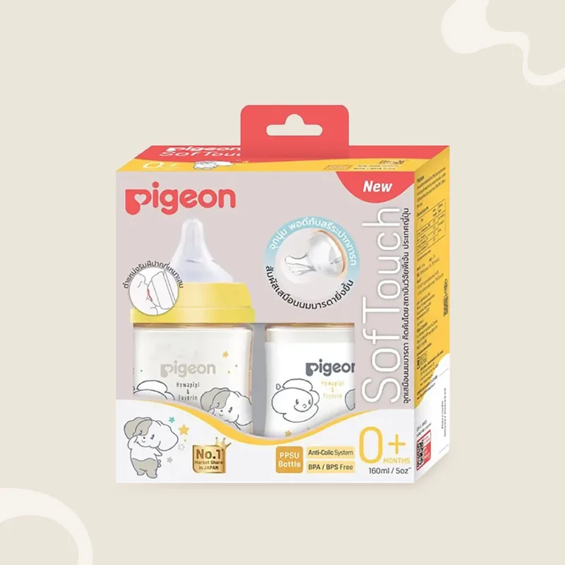 ขวดนม PIGEON ทรงใหม่ที่มีรูปทรงจับได้ง่ายขึ้น มาพร้อมลวดลายสุดน่ารัก และจุกนม SoftTouch ที่พัฒนามาจากการเลียนแบบการดูดตามธรรมชาติของทารก ผลิตจากซิลิคอนที่อ่อนนุ่มพิเศษ สัมผัสเสมือนเต้านมมารดามากยิ่งขึ้น หมดปัญหาเรื่องการสับสนเต้า ตรงขวดมีเส้นบอกตำแหน่งริมฝีปากเพื่อให้พอดีกับปากทารก มีให้เลือกด้วยกัน 2 ขนาด คือ ขนาด 5 ออนซ์จะมาพร้อมจุกขนาด SS และ ขนาด 8 ออนซ์จะมาพร้อมจุกขนาด M