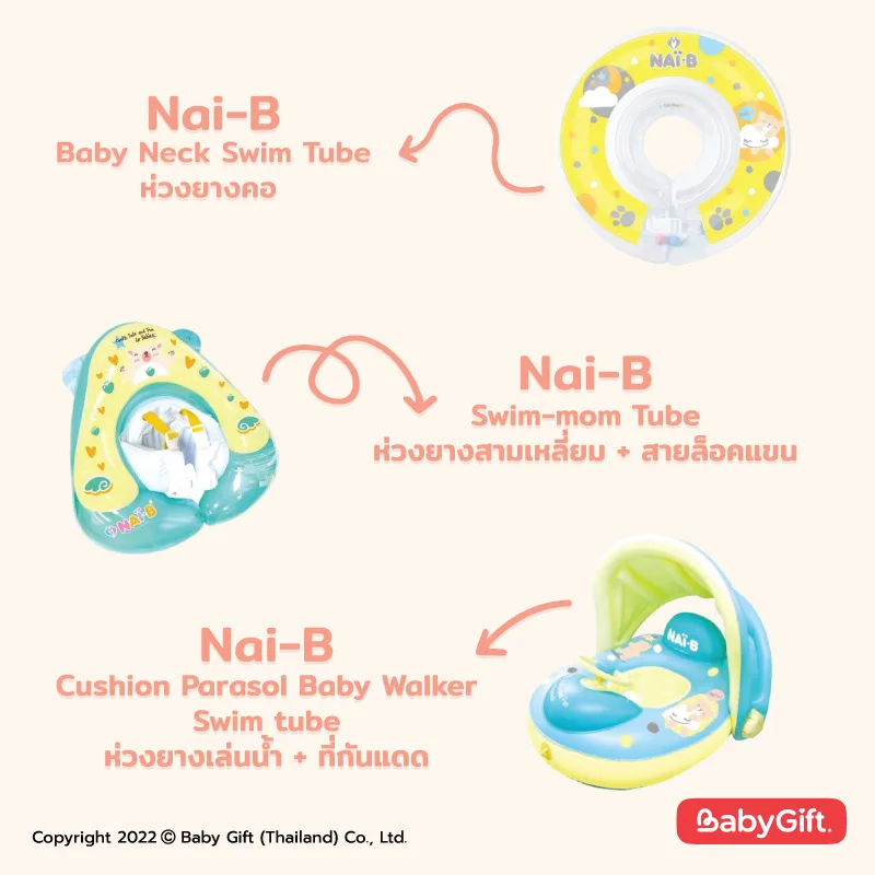 • ห่วงยางทารก ที่ช่วยประคองช่วงคอ หรือ ช่วยซัพพอร์ตทั้งตัวเด็กได้ ให้ลูกสามารถนอนคว่ำหรือหงายลอยตัวได้ หรือจะเลือกแบบที่มีปลอกแขนสวมเพื่อช่วยในการลอยตัว ควรเลือกขนาดที่พอดีตัวลูก เรามีห่วงยางทารกและอุปกรณ์เล่นน้ำแบบปลอดภัยมาแนะนำ เช่น แบรนด์ Nai-BLele