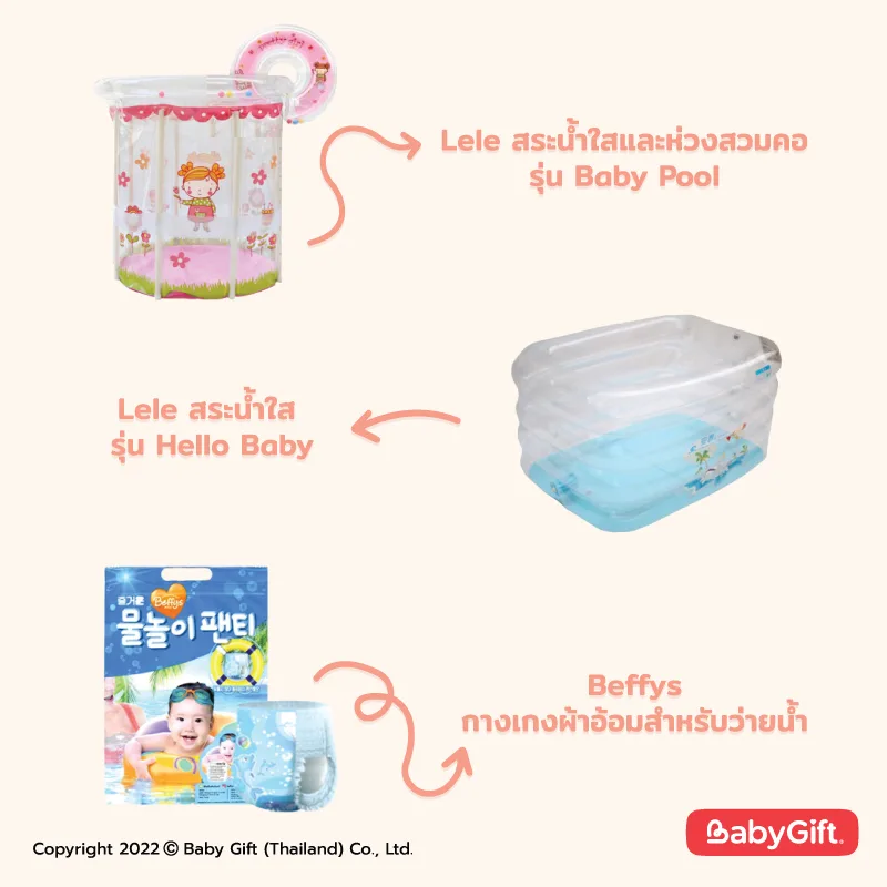 • ชุดว่ายน้ำ หรือ กางเกงผ้าอ้อมสำหรับว่ายน้ำ ควรเลือกชุดว่ายน้ำที่มีขนาดพอดีกับตัวลูก ไม่คับหรือหลวมจนเกินไป หากลูกยังเล็กบอกความต้องการว่าอยากฉี่หรืออึ ยังไม่ได้ ควรจะใส่กางเกงผ้าอ้อมสำหรับว่ายน้ำป้องกันลูกฉี่หรืออึในสระ แบรนด์แนะนำ เช่น Beffys
