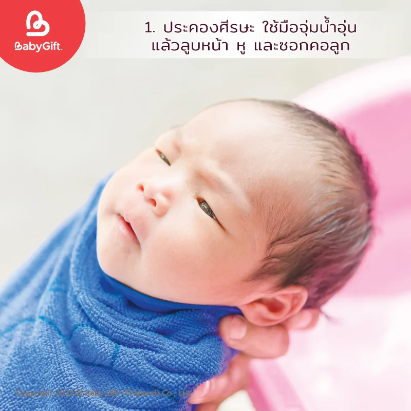 1. ให้ห่อตัวลูกน้อยด้วยผ้าขนหนูให้กระชับลำตัว อุ้มลูกน้อยไปที่อ่างน้ำ แล้วใช้มือจุ่มน้ำอุ่นค่อย ๆ ลูบใบหน้า หู และซอกคอลูกน้อย เพื่อให้ลูกน้อยปรับตัว และรู้ตัวว่ากำลังจะอาบน้ำ