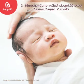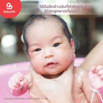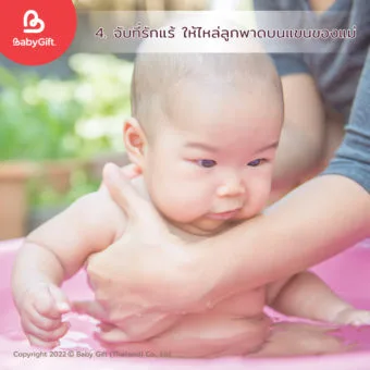 2. ประคองศีรษะลูกน้อยให้อยู่ในอุ้งฝ่ามือ ใช้แขนและข้อศอกหนีบลำตัวลูกไว้ข้างเอว แล้วใช้มือพับใบหูลูก 2 ข้างไว้ เพื่อไม่ให้น้ำเข้าหู