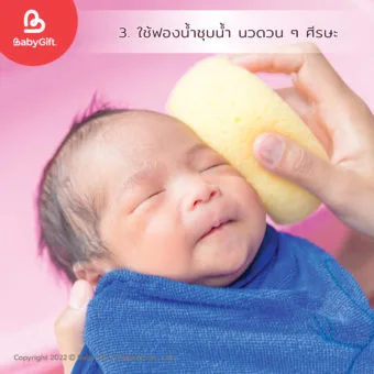 3. ใช้ฟองน้ำชุบน้ำแล้วบีบน้ำออกให้หมาด เช็ดเบา ๆ ทั่วศีรษะลูก จากนั้นหยดสบู่ 1-2 หยดใส่มือคุณแม่ แล้วนวดวน ๆ ศีรษะลูก แล้วล้างออก ซับผมลูกให้แห้ง