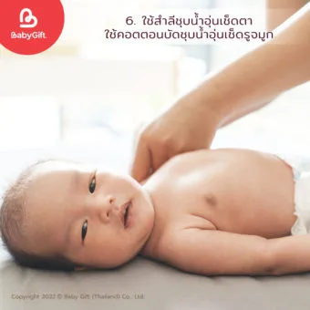 6. ใช้สำลีชุบน้ำอุ่น 2 ก้อน เช็ดตาของลูกน้อย จากหัวตาไปหางตาทีละข้าง และใช้คอตตอนบัดหัวเล็กชุบน้ำอุ่น เช็ดรูจมูก 2 ข้าง และใช้สำลีชุบแอลกอฮอล์ 70 % เช็ดสะดือลูกน้อยอย่างเบามือ