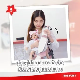 ค่อยๆใส่สายสะพายทีละข้าง โดยใช้มือประคองลูกตลอดเวลา