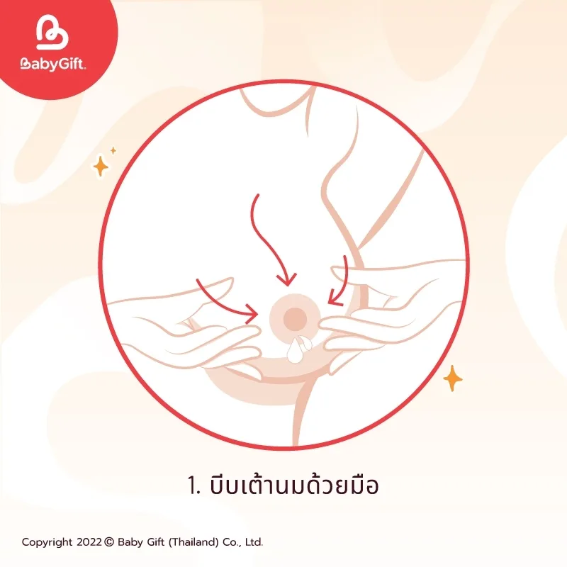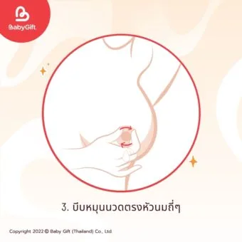 ให้คุณแม่ใช้นิ้วโป้งและนิ้วชี้จับตรงหัวนม แล้วบีบนวดหัวนมในลักษณะหมุน ๆ รอบหัวนมประมาณ 5-10 ครั้ง ระหว่างนวดควรจะมีน้ำนมไหลออกมาด้วยนะคะ