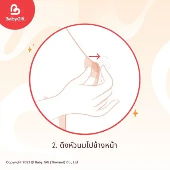 ให้คุณแม่ใช้นิ้วโป้งและนิ้วชี้จับตรงหัวนมไว้ แล้วดึงหัวนมไปข้างหน้า ดึงให้สุดเท่าที่หัวนมจะยื่นออกไปได้ ทำอย่างสม่ำเสมอ ประมาณ 5-10 ครั้ง