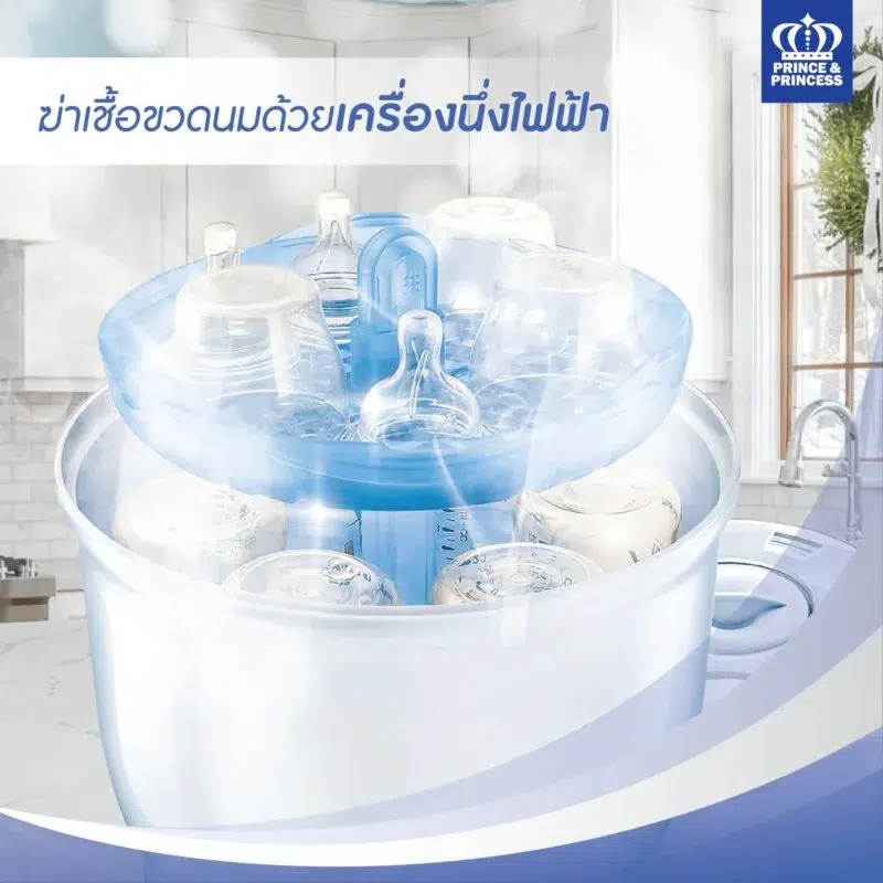 การฆ่าเชื้อด้วยการนึ่ง ถือเป็นวิธีการที่ง่าย และใช้ระยะเวลาสั้นกว่าการต้ม เพียงแค่เติมน้ำตามปริมาณที่กำหนด วางฐานรองนึ่งให้เข้าที่ นำขวดนมที่ถอดชิ้นส่วนล้างอย่างสะอาดแล้ว มาวางคว่ำลง แล้วปิดฝากดปุ่มให้เครื่องทำงาน เครื่องจะทำให้น้ำที่เราเติมไปเดือดและละเหยไอน้ำให้ลอยขึ้นไปฆ่าเชื้อ หลังจากเครื่องทำงานเสร็จ เพียงนำที่คีบขวดนมออกมามาผึ่งให้แห้งก็สามารถนำไปใช้งานต่อได้อย่างสบายใจค่ะ