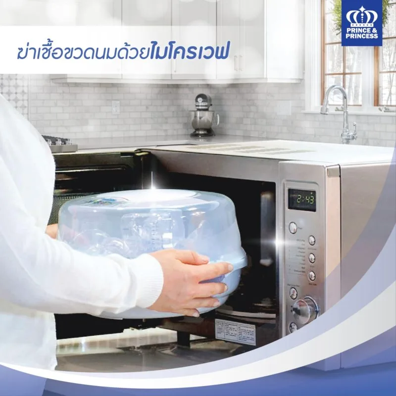 วิธีนี้ถือเป็นหลักการเดียวกับเครื่องนึ่งไฟฟ้า คือเป็นการทำให้น้ำเดือดและละเหยเป็นไอน้ำขึ้นมาฆ่าเชื้อ เหมาะสำหรับบ้านที่มีเครื่องไมโครเวฟอยู่แล้ว หรือผู้ที่ต้องเดินทางเป็นประจำ เนื่องจากมีน้ำหนักเบา พกพาง่าย และเป็นขนาดมาตรฐานสามารถใช้กับเครื่องไมโครเวฟที่ใดก็ได้ แต่ต้องเช็คให้มั่นใจว่าขวดนมที่คุณพ่อคุณแม่เลือกใช้อยู่สามารถนำเข้าเครื่องไมโครเวฟได้นะคะ เพียงแค่เติมน้ำร้อนตามปริมาณที่กำหนด วางชิ้นส่วนขวดนมคว่ำลงแล้วปิดฝา ล็อคฝาปิดให้เรียบร้อย และนำไปวางในเครื่องไมโครเวฟ ใช้เวลาประมาณ 2-6 นาที ขึ้นอยู่กับความร้อนของเครื่องไมโครเวฟแต่ละรุ่น เพียงเท่านี้ก็ฆ่าเชื้อขวดนมกันได้แบบง่าย ๆ แล้วค่ะ