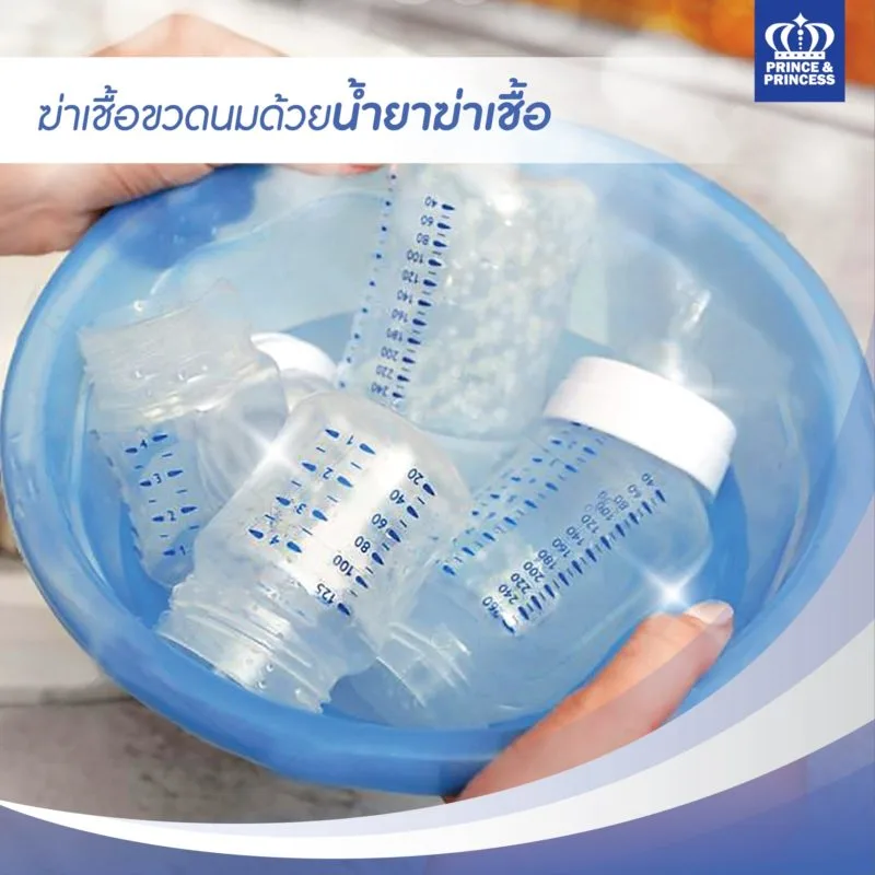 การฆ่าเชื้อด้วยยาฆ่าเชื้อ มีทั้งแบบเม็ด และแบบผง โดยเติมน้ำในกะละมังปริมาณ 2.5 ลิตร แล้วนำตัวยาใส่ลงไปรอจนกว่ายาละลายเข้ากับน้ำ แล้วจึงนำชิ้นส่วนขวดนมกดลงไปให้จมน้ำ เช็คให้มั่นใจว่าไม่มีฟองอากาศหลงเหลือด้านใน แช่ทิ้งขั้นต่ำ 20 นาที หรือแช่ทิ้งไว้ได้จนกว่าจะใช้งานค่ะ