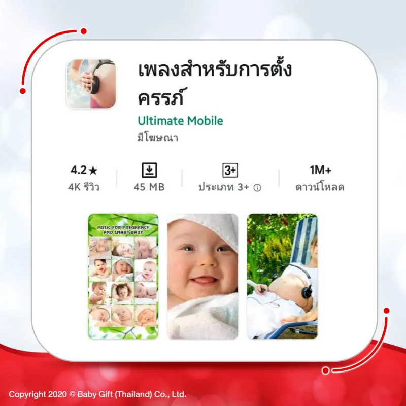 เป็นแอพที่รวบรวมเพลงสำหรับการตั้งครรภ์ ฟรี! มีสไตล์เพลงดนตรีคลาสสิกหลากหลายที่จะช่วยให้คุณแม่และลูกน้อยในท้องอารมณ์ดี โดยดนตรีคลาสสิกนั้นได้รับการพิสูจน์แล้วว่าเป็นเพลงของปัญญา ที่จะช่วยกระตุ้นการทำงานของสมองในการพัฒนาเด็กทารก ช่วยให้คุณแม่ลดความเครียดและความวิตกกังวลลงได้ รวมไปถึงภาวะซึมเศร้าที่หญิงตั้งครรภ์หลายคนนั้นมีอาการ เมื่อคุณแม่มีอารมณ์ที่ดีอยู่เสมอ ทุกๆวันร่างกายจะหลั่งสารแห่งความสุขออกมาผ่านไปยังสายสะดือสู่ทารก ทำให้ลูกน้อยมีพัฒนาการที่ดีทั้งสมอง (IQ) และอารมณ์ (EQ) อีกด้วย เมื่อรู้ถึงเหตุผลดีๆ ของการเปิดเพลงให้เจ้าตัวน้อยในท้องฟังแล้ว ลองตามไปโหลดแอพแล้วเปิดเพลงให้อารมณ์ดีทั้งแม่ทั้งลูกกันได้เลย