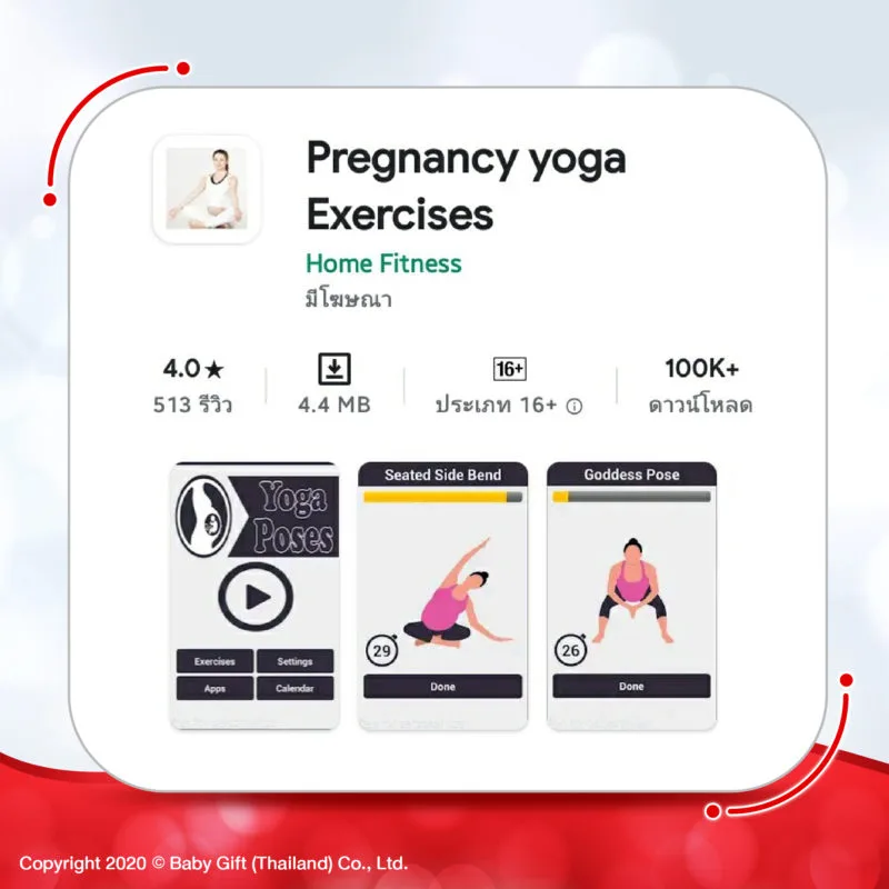 เป็นแอพโยคะสำหรับคนตั้งครรภ์ ที่คุณแม่สามารถโยคะออกกำลังกายเบาๆที่บ้านตามได้ และรู้เทคนิคการผ่อนคลายอื่นๆที่ทำได้ระหว่างตั้งครรภ์ เพียงทำตามบทเรียนและแบบฝึกหัดโยคะที่จัดทำขึ้นโดยเฉพาะสำหรับสตรีมีครรภ์ หากคุณแม่พึ่งเริ่มออกกำลังกายใหม่ๆ ควรเริ่มจากการเคลื่อนไหวเล็กๆ น้อยๆ เพื่อผ่อนคลายกล้ามเนื้อของร่างกายและการไหลเวียนโลหิต ระวังอย่าหักโหมมากเกินไป และหยุดทันทีถ้าหากพบอาการที่ทำทำให้เจ็บหรือรู้สึกไม่สบายใจ เมื่อคุณแม่โยคะแบบถูกวิธีที่บ้านเป็นประจำทุกวัน จะช่วยลดอาการปวดหลังท้องผูกท้องอืดและบวม ปรับปรุงอารมณ์ของคุณแม่ ช่วยปรับบุคลิกท่าทางของคุณแม่ได้ดี ส่งเสริมกล้ามเนื้อความแข็งแรงและความอดทน และยังช่วยให้คุณแม่นอนหลับได้ดีขึ้นอีกด้วย