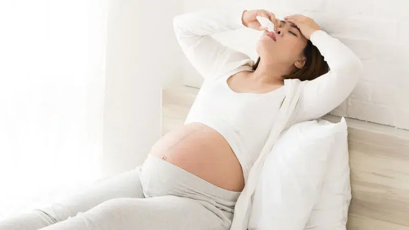 ฮอร์โมนที่เปลี่ยนไปนำไปสู่ปัญหาในโพรงจมูกของคุณแม่ค่ะ เพราะฮอร์โมนที่เพิ่มขึ้น จะทำให้ร่างกายของคุณแม่ผลิตเลือดเพิ่มขึ้นไปด้วย เส้นเลือดฝอยภายในจมูกจึงบวมและแตกออกมาได้ง่าย เพราะอย่างนั้นถ้าคุณแม่รู้สึกระคายเคืองในจมูก ขอแนะนำให้คุณแม่ใช้น้ำเกลือที่หาซื้อได้ตามร้านขายยาทั่วไปล้างจมูกนะคะ และห้ามใช้ของแข็งแหย่เข้าไปในโพรงจมูกโดยเด็ดขาดเลยค่ะ