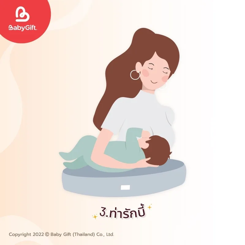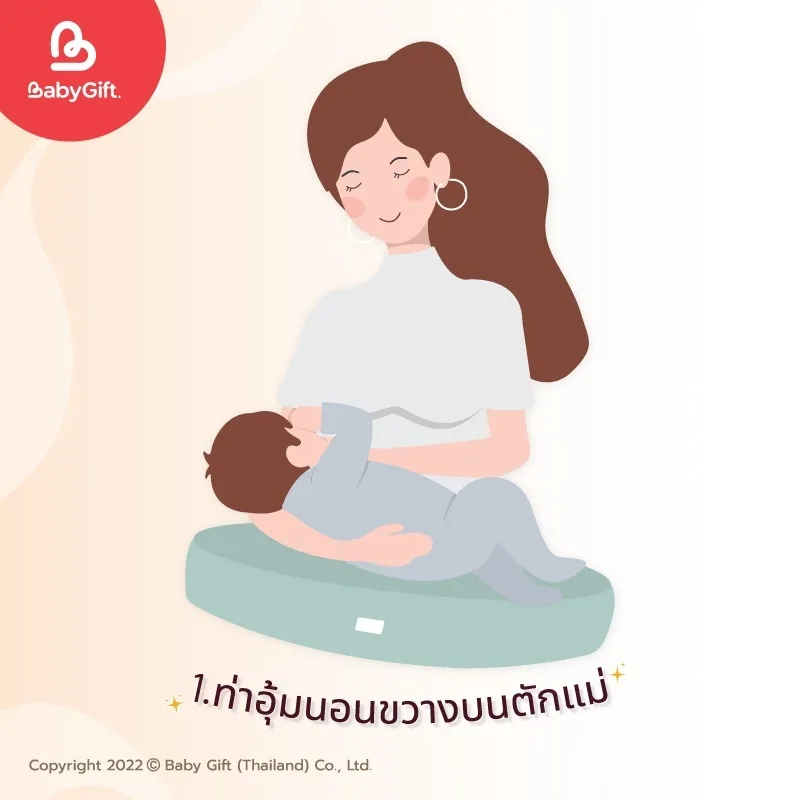 อุ้มลูกวางขวางไว้บนตัก ให้ท้ายทอยอยู่ที่แขนของคุณแม่ ปลายแขนของคุณแม่ช้อนไปที่ส่วนหลังและก้นของลูก ตะแคงตัวลูกเข้าหาเต้านมให้หน้าอกลูกและคุณแม่ชิดกัน มืออีกข้างพยุงเต้านม