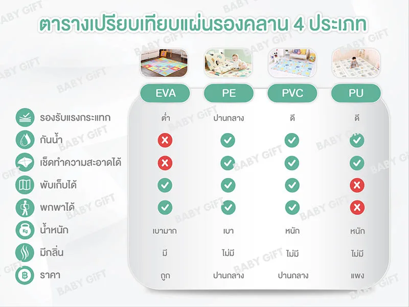วัสดุประเภท PVC นั้น มีลักษณะคล้ายยาง จึงมีความหนานุ่ม เหนียวแน่น และมีความยืดหยุ่นสูง จึงรองรับแรงกระแทกได้ดี เมื่อถูกกดทับจะคืนตัวได้ดี ทนทานกว่า ไม่ฉีกขาดง่าย และเป็นวัสดุชนิด PVC นั้น จะเป็นวัสดุที่ปราศจากสารพิษ NON-TOXIC เมื่อนำมาทำแผ่นรองคลาน จึงปลอดภัยต่อลูกน้อยมาก ๆ และคุ้มค่าทั้งในแง่ของความทนทาน และอายุการใช้งาน และแผ่นรองคลานที่ทำจาก PVC ยังสามารถกันน้ำได้ดี เพราะคุณสมบัติของ PVC นั้น ช่วยป้องกันการซึมไหลผ่านของของเหลวได้ จึงไม่ต้องกังวลหากลูกน้อยทำน้ำ หรือนมหก ก็สามารถเช็ดออกได้ง่าย ๆ และไม่เป็นแหล่งสะสมของเชื้อโรค